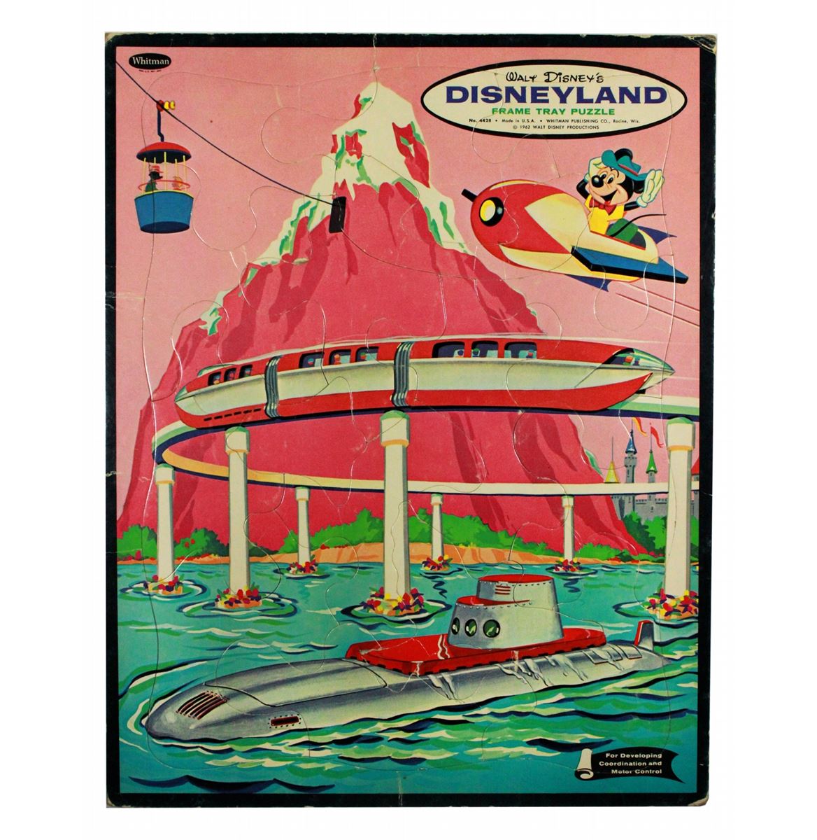 A beautiful vintage frame-tray puzzle featuring Mickey having fun in Tomorrowland at Disneyland, overlooking the Monorail. The puzzle measures 14.5"x11.5" in the frame-tray. Contains all of its original pieces, and is a fantastic piece of vintage ephemera. There are patches of light wear to the front of the piece, but is in good condition overall.