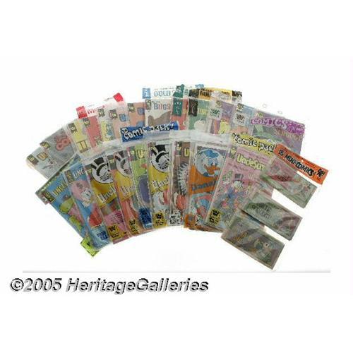 <B>Mickey Mouse</B></I>, <B>Donald Duck</B></I>, <B>Uncle Scrooge</B></I>, etc.). The majority of these pre-packs are from the early 1980s. As for the various bag styles, not to mention the different logo styles on the comics, they're too numerous to mention. And do we need to mention that many of these Whitman issues were <I>only</B></I> released in these pre-packs, and only sold in department stores, supermarkets, etc., not on newsstands? Due to the nature of these pre-packs, we can't determine every comic included in them, but we can confirm that the following comics are in there: " "<B>Uncle Scrooge</B></I> #69, 103, 104, 114, 117, 130, 154, 155, 162-170, 174, 176-178, 185-187, 191, 193, 195, 197, 200, 201, 204, and 205; Looney Tunes #43; Donald Duck #216, 219, 221, 234, and 236; " "<B>Walt Disney's Comics and Stories</B></I> #130, 493, and 495; and " "<B>Huey, Dewey, and Louie</B></I> #74. Since these Whitman issues are extremely difficult to find ""in grade,"" you'll be pleased to know that the condition of the comics inside is excellent. Bid on 'em, enjoy 'em, but whatever you do, don't cut 'em open! <BR><BR><B>Important notice:</B> Heritage usually auctions material at the rate of 200-250 lots per hour. On some occasions eBay Live bid software or the Internet may not be able to keep up with the pace of the auction. We recommend placing a realistic absentee bid now as insurance to avoid disappointment. Occasionally the auctioneer may eliminate or reject an eBay Live bid, and the auctioneer may also reopen a lot after the close of the eBay live bidding (usually because we missed an audience bid), and may reject your bid even if it shows you as the winning bidder. By bidding via eBay Live, you agree that Heritage may award the lot to another bidder at its sole discretion under the circumstances described above or any other reasonable circumstances. Since eBay bids are not shown to us until we open the lot on the floor, we treat those bids just like floor bids