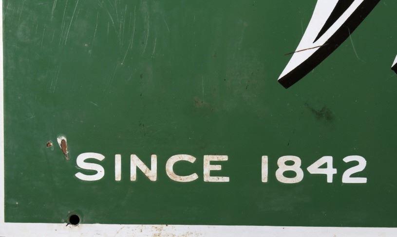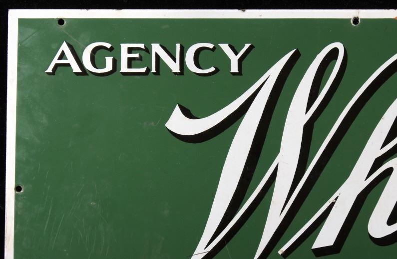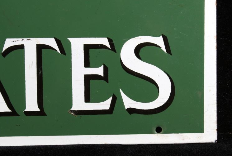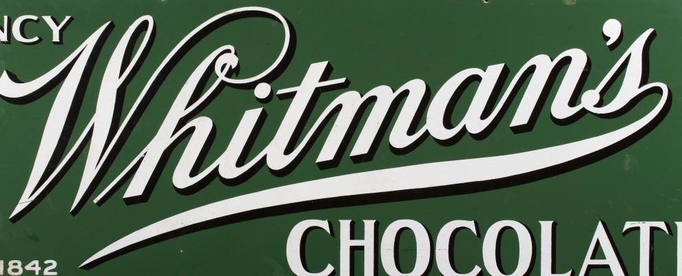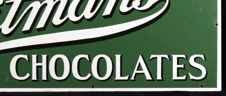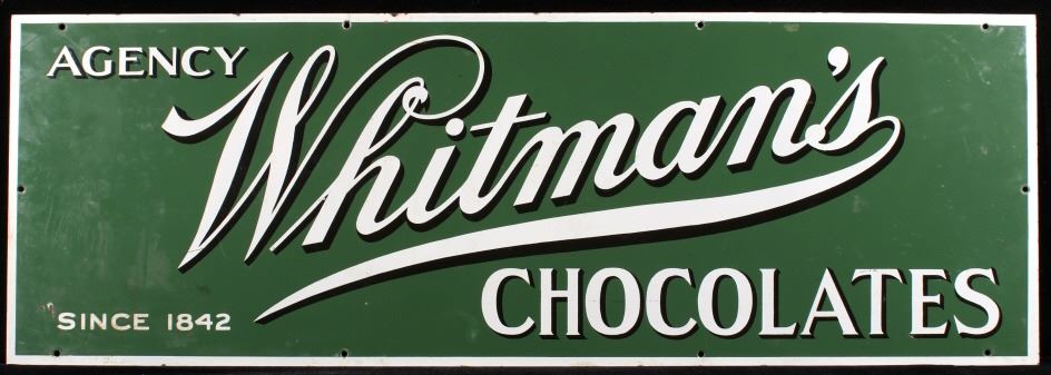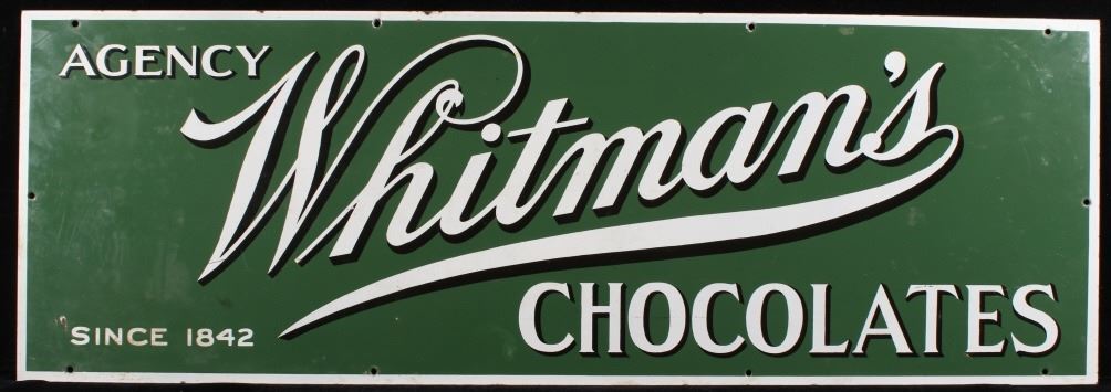 For you consideration in this lot we have a Whitman's Chocolates porcelain enamel advertising sign originating from the early 20th century. Whitman's Chocolate was founded in 1842 by Stephen F. Whitman. The sign features a green background with a white border and white and black lettering. The sign is marked "Agency Whitman's Chocolate's - Since 1842". The piece shows porcelain enamel construction with numerous mounting holes. The piece shows good condition overall with some light wear across the piece. The sign measures 39 1/2" wide by 13 1/2" tall.
