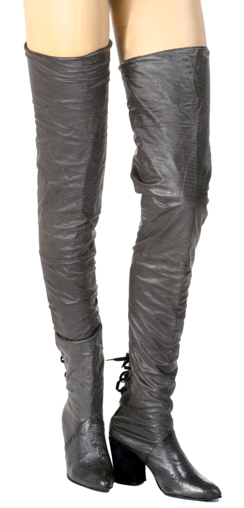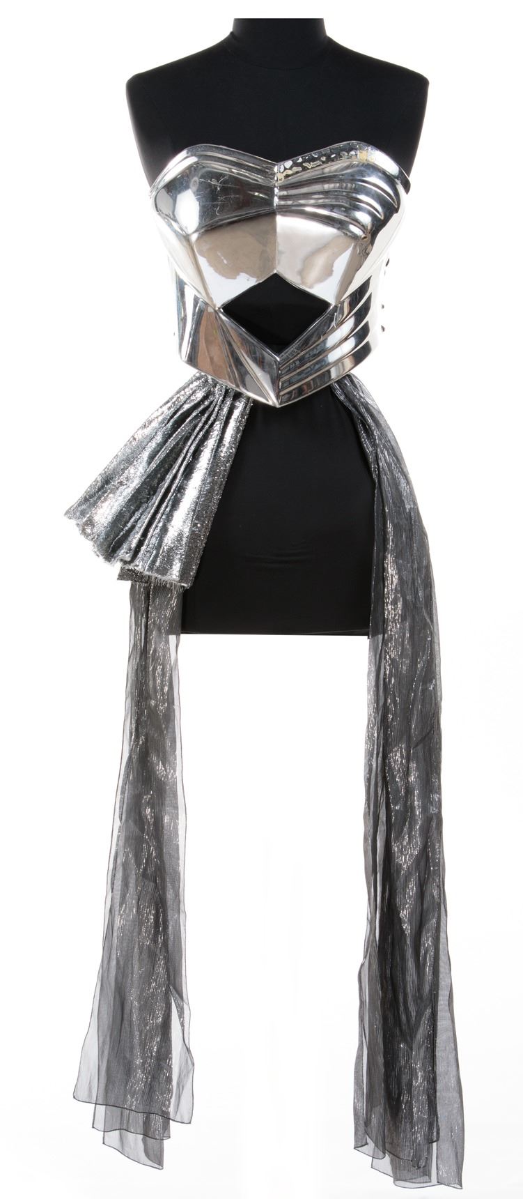 440. Whitney Houston "Rachel Marron" "Queen of the Night" costume elements from The Bodyguard. (Warner Bros., 1992)(5) Original production costume elements from the most iconic costume in this classic romantic action film. Including (1) vacuum formed chrome surfaced bodice piece, (1)vacuum formed chrome surfaced helmet of a style unused in the final edit of the film, (1) long pleated silver skirt, (1) some yards and sections of pleated and corrugated silver lamé fabric and (1) pair of thigh-high gunmetal silver boots. The complex “Queen of the Night” costume incorporated expert armorer Chris Gilman (of Global Effects) created armor components.