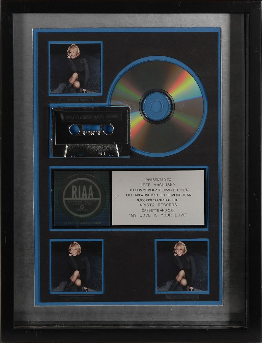 Official serial number hologram-style RIAA triple platinum sales award presented “to commemorate RIAA certified multi-platinum sales of more than 3,000,000 copies of the Arista Records cassette and C.D. ‘My Love Is Your Love.’” Framed with its plate, CD, cassette, and three small images of the album cover denoting platinum sales to an overall size of 13 x 16.75. Award retains its original backing with an Ill-Eagle Enterprises label. In fine condition.