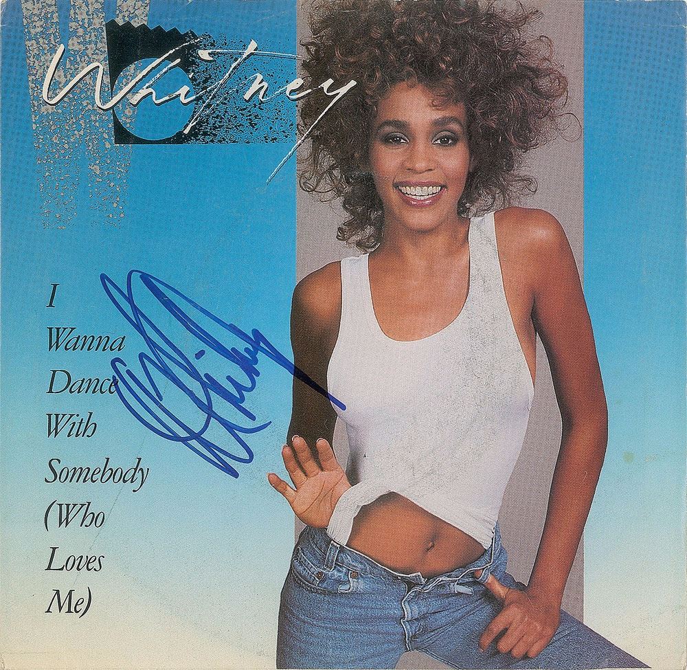 45 rpm record single of 'I Wanna Dance With Somebody (Who Loves Me / Moment of Truth,' signed on the front of the sleeve in blue felt tip by Whitney Houston. In fine condition, with scattered light creasing. The record is included. Originally obtained by in-person specialist Mike Wehrmann.