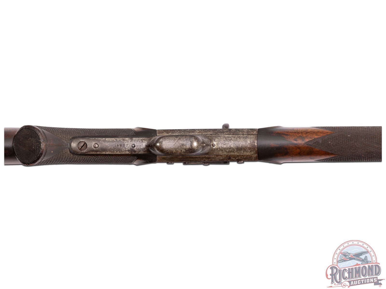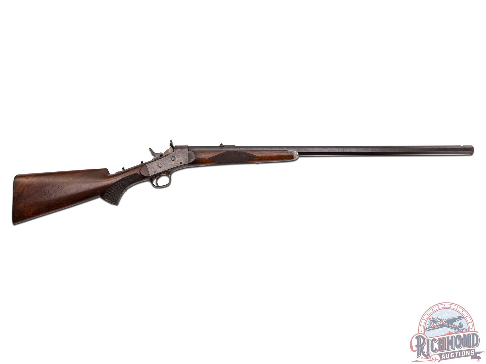 Built by Whitneyville Armory Company in New Haven, Connecticut utilizing the T.S.S. Laidley patent circa 1880. Rifle features 30" blued full octagon with missing front dovetail sight and rear folding graduated rear sight with missing tang peep sight. Barrel is marked at breech "40 CAL/50 GB". Case-hardened rolling block action with plain trigger and tang marked "Whitneyville Armory Company" and patent markings. Walnut checkered pistol grip stock with shotgun butt plate and matching walnut checkered splinter forearm with pewter nose cap. Rare rifle. J.T. Livengood Collection. CALIBER: 40-50. S/N: 12891. FFL STATUS: Antique.