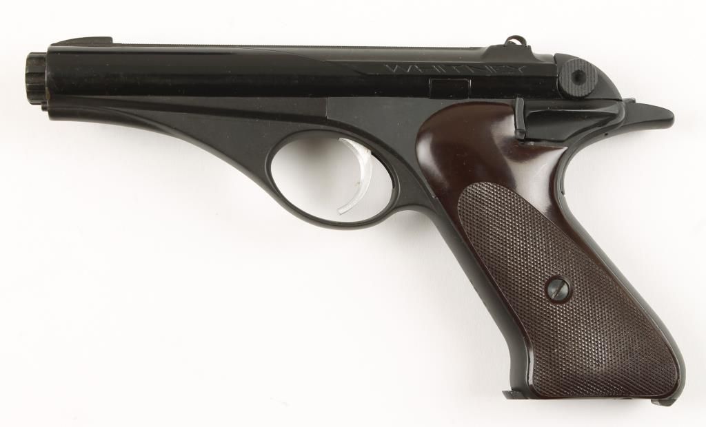 Single action semi auto rimfire pistol with 4-3/4" barrel. Blued finish, brown checkered plastic grips, aluminum alloy frame and fixed sights. Discontinued in 1962. Fair bore and good action. Includes original box, manual, box of Peters .22 lr ammo and 1 magazine. Condition: Good overall showing light scratching on right side fron\m storage. *Curio & Relic Firearm*