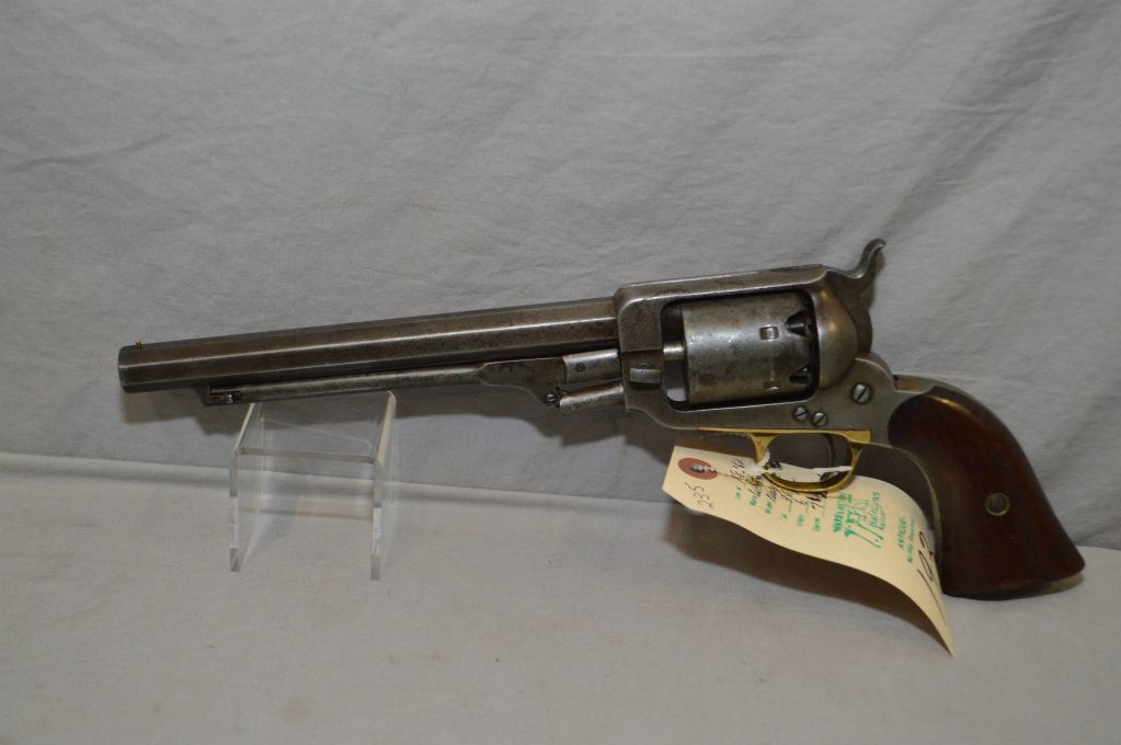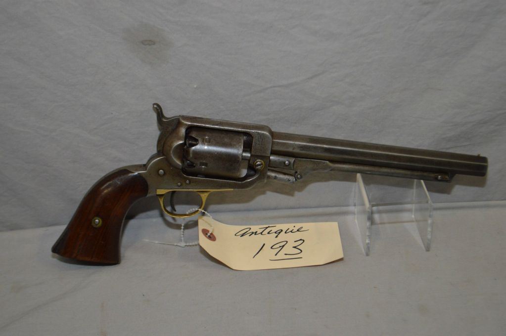 Whitney Model Navy 2nd Model .36 Perc Cal 6 Shot Revolver w/ 7 1/2" octagon bbl [ blued finish faded to grey, cylinder machined with six safety notches at back, wedge style loading lever with serial # 18360 , brass trigger guard, walnut grips with right side chipped by back strap,also numbered 18360, and carved CD, barrel marked E.Whitney N.Haven, Circa late 1850's early 1860's, Civil War Era, quantity approx. 33,000 ] Ser # 18360 ANTIQUE NO PAL REQ