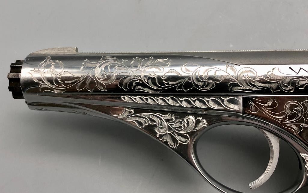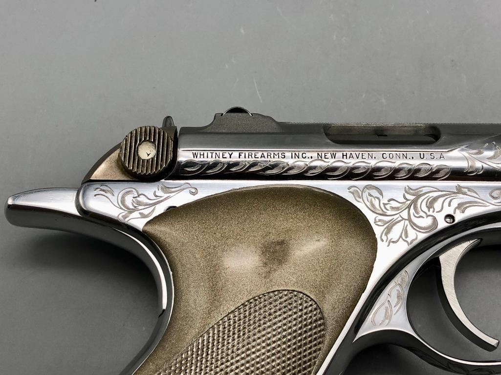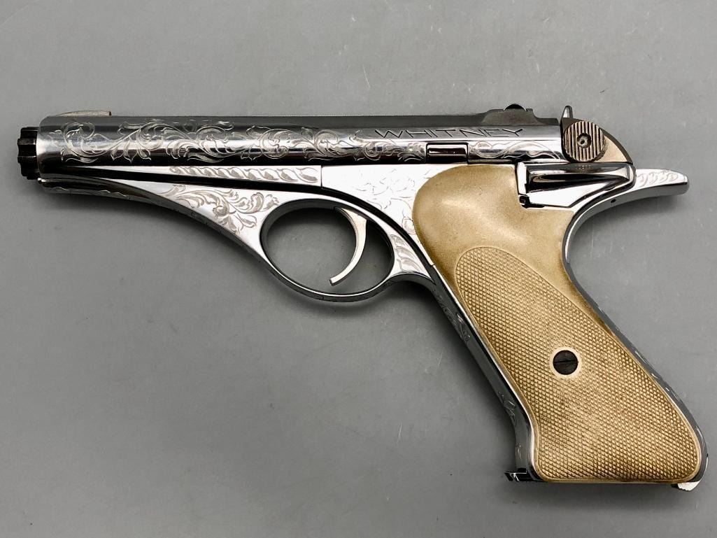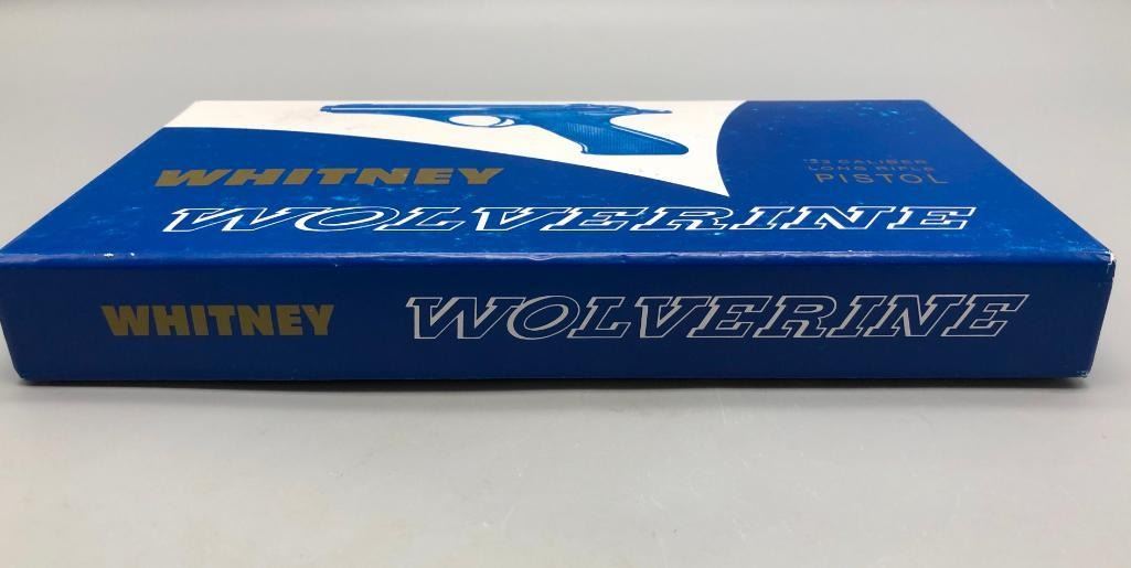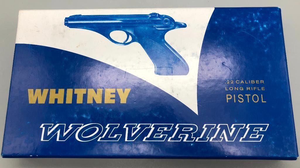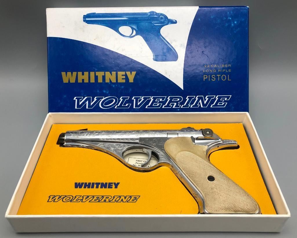 Presented for sale in this lot is an engraved Whitney Wolverine semi-auto pistol. It comes with a Whitney Wolverine blue and white box. This .22 caliber pistol is in great condition, showing minimal signs of wear and aging. It has a custom engraved pattern featuring a flowing floral pattern with vines and leaves. It also has aftermarket faux ivory grips and sports a highly polished finish. This pistol and is in fully functional condition. These original Whitney's are getting harder to find in great condition and this one would make a great addition to any collection! MAKER: Whitney. Serial No. 30242. APPROX AGE: Circa 1956 - 1957. SIZE: Barrel measures 4-1/2 inches. CONDITION: Good, minimal wear expected. Please look closely at the pictures as they are an important part of our description and are hereby incorporated into the description, specifically with regards to condition. SHIPPING: There will be a $25 handling / packaging fee for shipping this lot. The actual cost of postage will be added on top of that. BUY IT NOW: If you would like to buy this item now, without waiting for the auction day to bid on it, we do offer this option (which is available up to 48 hours before the actual auction starts). The “Buy it Now†price is the high estimate of this lot (plus applicable fees and the Buyer's premium is discounted to 10% when using the Buy it Now option). If you would like to exercise this option, you must contact us by email (or phone as long as you talk to someone live). Reference this lot number and your intention to "Buy it Now." *****This firearm requires an FFL Transfer*****