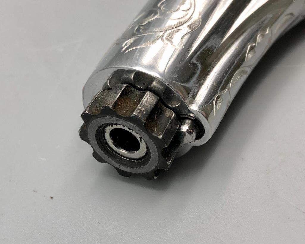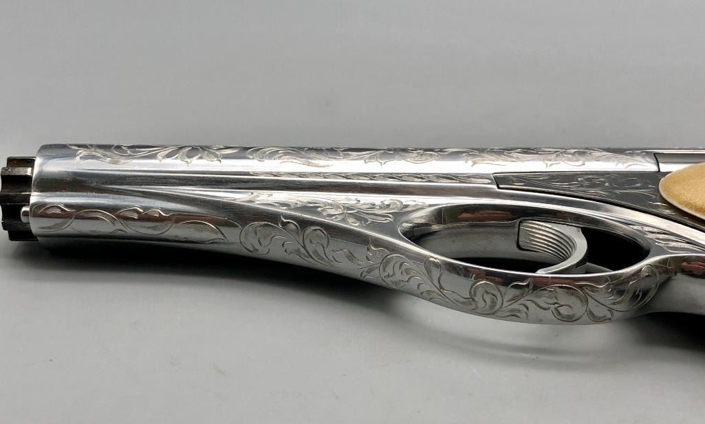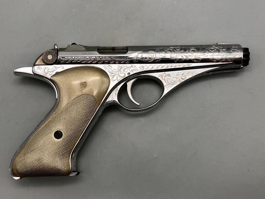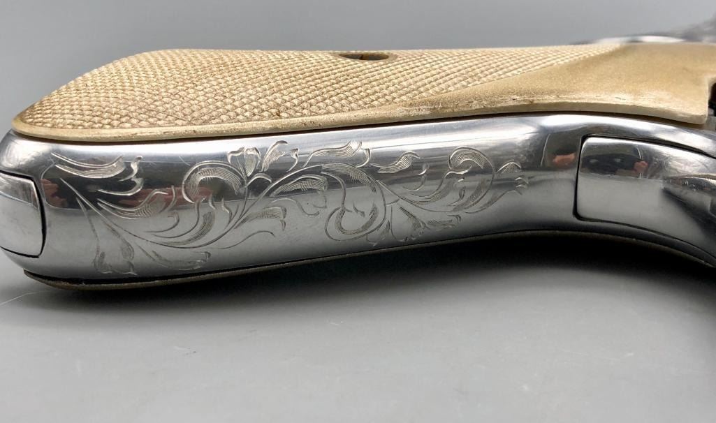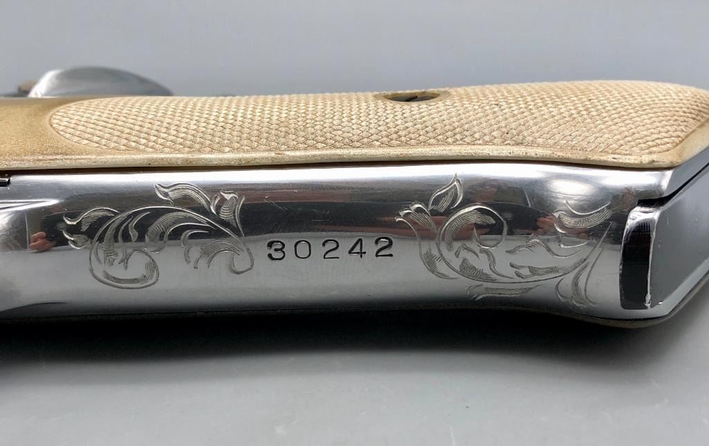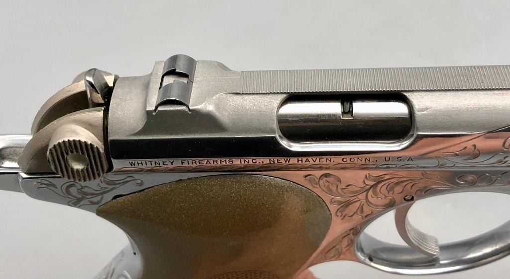 Presented for sale in this lot is an engraved Whitney Wolverine semi-auto pistol. It comes with a Whitney Wolverine blue and white box. This .22 caliber pistol is in great condition, showing minimal signs of wear and aging. It has a custom engraved pattern featuring a flowing floral pattern with vines and leaves. It also has aftermarket faux ivory grips and sports a highly polished finish. This pistol and is in fully functional condition. These original Whitney's are getting harder to find in great condition and this one would make a great addition to any collection! MAKER: Whitney. Serial No. 30242. APPROX AGE: Circa 1956 - 1957. SIZE: Barrel measures 4-1/2 inches. CONDITION: Good, minimal wear expected. Please look closely at the pictures as they are an important part of our description and are hereby incorporated into the description, specifically with regards to condition. SHIPPING: There will be a $25 handling / packaging fee for shipping this lot. The actual cost of postage will be added on top of that. BUY IT NOW: If you would like to buy this item now, without waiting for the auction day to bid on it, we do offer this option (which is available up to 48 hours before the actual auction starts). The “Buy it Now†price is the high estimate of this lot (plus applicable fees and the Buyer's premium is discounted to 10% when using the Buy it Now option). If you would like to exercise this option, you must contact us by email (or phone as long as you talk to someone live). Reference this lot number and your intention to "Buy it Now." *****This firearm requires an FFL Transfer*****