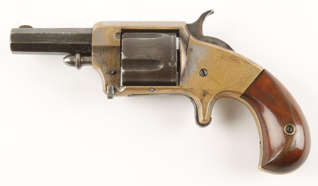 Large frame single action spur trigger solid frame 5 shot revolver circa 1870's with 2-1/2" octagon barrel. Plated brass frame, blued barrel, rosewood birdshead grips and fixed sights. Barrel has been refinished and markings are very faint. Good working action. Condition: Fair to good showing 10% finish, light pocket of pitting on cylinder and grips are good. *Antique Firearm*