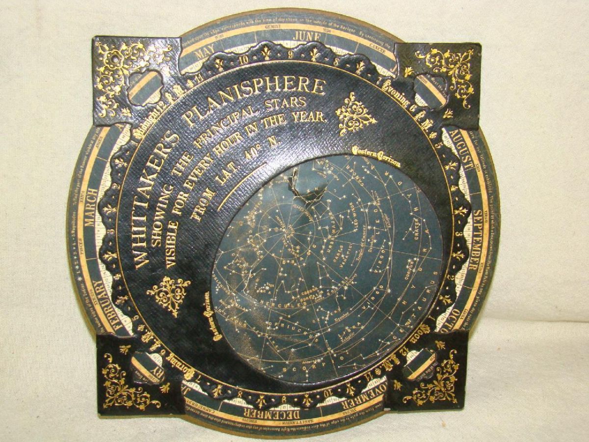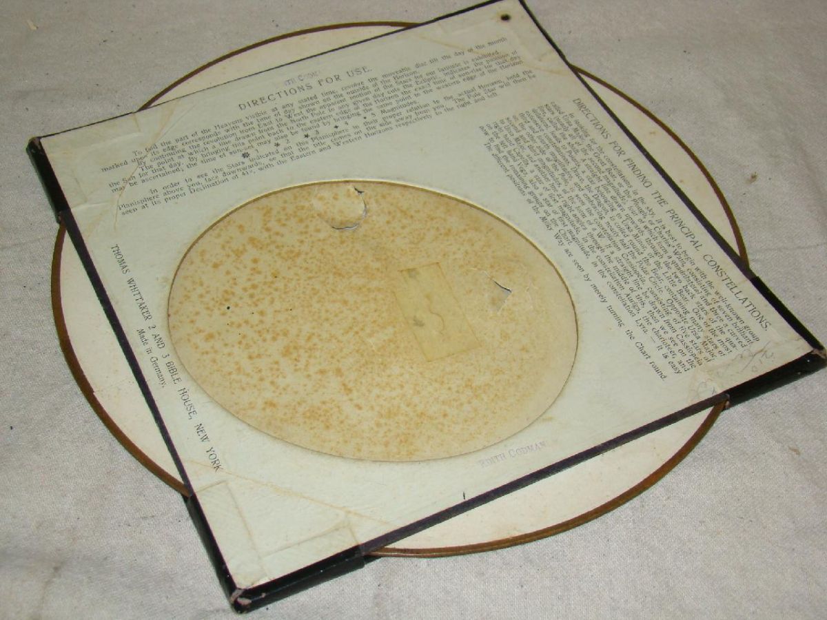 Showing the Principal Stars Visible for Every Hour in the Year, published by Thomas Whittaker, NY." c1880 Heavy card stock, with revolving printed star chart, gilt embossed cover, with cut out windows for reading the hours, degrees, calendars. Directions on back. Approx. 12" in diameter