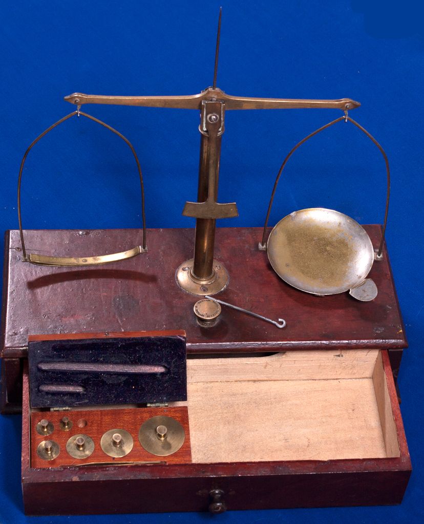 Wooden box, 10" x 4.25" x 2.25". With slide-out drawer. Brass knob with Whittal Tatum & Co. Inscribed on the top. Drawer contains brass scale components, which screw into brass receiver on top of box. Small inner wood box contains multiple machined brass weights from small to large, along with brass tweezers for placement. Round scale tray is 2.75" in diameter (one tray missing). Tray suspenders fold flat for storage. - Maish Collection -58897