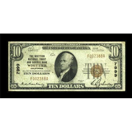 <B>Whittier, CA</B></I> - $10 1929 Ty. 1 <B>The Whittier National Trust & Savings Bank</B></I> Ch. # 7999<BR> A well margined <B>Fine+</B></I> up for your bidding attention tonight.<BR><I>From The Kansas City Collection.</B></I><BR><BR><b>Shipping:</b> Coins & Currency (<a target="_blank" href="http://www.heritageauctions.com/common/shipping.php">view shipping information</a>)