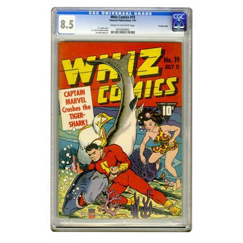 <B>Whiz Comics #19 Crowley Copy pedigree (Fawcett, 1941) CGC VF+ 8.5 Cream to off-white pages.</B></I> C. C. Beck drew this issue's underwater cover in addition to providing interior art. Mac Raboy handled art chores on the Dr. Voodoo feature. Overstreet 2005 VF 8.0 value = $544; VF/NM 9.0 value = $835. CGC census 12/05: 1 in 8.5, 1 higher.