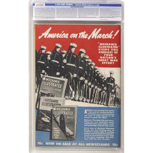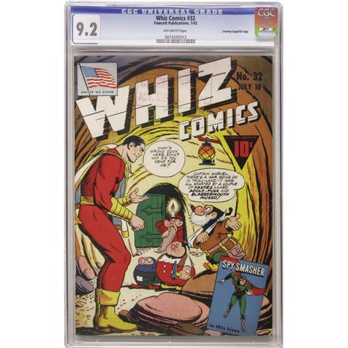 <B>Whiz Comics #32 Crowley Copy/File Copy (Fawcett, 1942) CGC NM- 9.2 Off-white pages.</B></I> The first appearance of the Trolls brings about a Hitler and Mussolini satire story in which the characters Adolf-Puss and Blabbermouth Musso wreak havok in Troll-Land. C. C. Beck contributes the cover and art. A Checking Copy stamp appears on the cover. Overstreet 2006 NM- 9.2 value = $725. CGC census 10/06: 2 in 9.2, 2 higher.<BR><BR><b>Shipping:</b> Slabbed Comic (<a target="_blank" href="http://www.heritageauctions.com/common/shipping.php">view shipping information</a>)