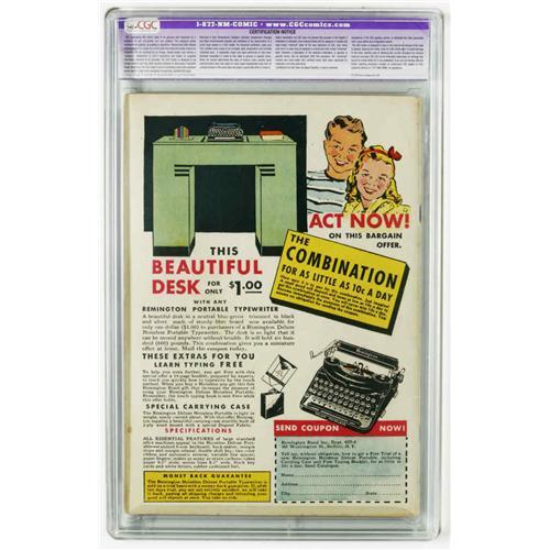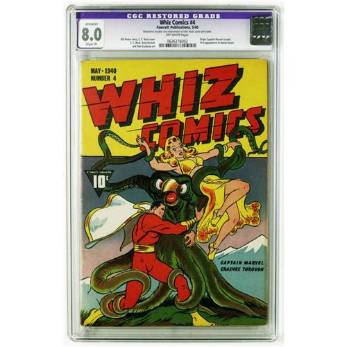 <B>Whiz Comics #4 (Fawcett, 1940) CGC Apparent VF 8.0 Slight (P) Off-white pages.</B></I> This very early Captain Marvel appearance is a Gerber "7," and a book that doesn't cross our path very often. In the issue, Dr. Sivana has already figured out that Billy Batson says "Shazam" to turn into Captain Marvel, so he gags the youngster and tries to induce amnesia! The issue has a C. C. Beck cover, with interior art by Beck and Pete Costanza. CGC notes, "Restoration includes: very small amount of color touch, spine split sealed." Overstreet 2005 GD 2.0 value = $292; VG 4.0 value = $584; FN 6.0 value = $876; VF 8.0 value = $1,825.