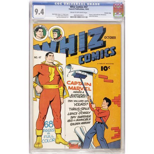 <B>Whiz Comics #47 (Fawcett, 1943) CGC NM 9.4 Cream to off-white pages.</B></I> C. C. Beck cover. Overstreet 2006 NM- 9.2 value = $420. CGC census 10/06: 2 in 9.4, 1 higher.<BR><BR><b>Shipping:</b> Slabbed Comic (<a target="_blank" href="http://www.heritageauctions.com/common/shipping.php">view shipping information</a>)