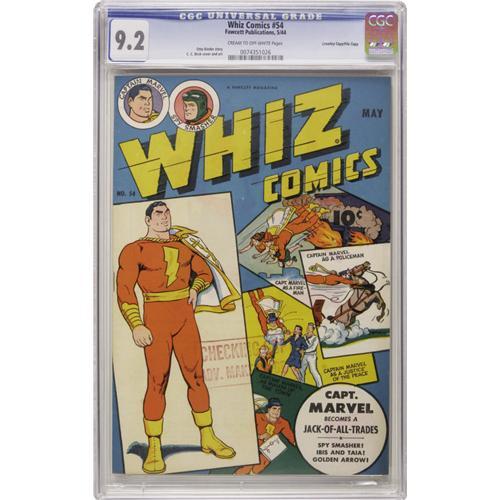 <B>Whiz Comics #54 Crowley Copy/File Copy (Fawcett, 1944) CGC NM- 9.2 Cream to off-white pages.</B></I> Cover and art by C. C. Beck. This copy has a "checking copy" stamp on the lower front cover. Currently, the next-highest copy is graded at a 7.0. Overstreet 2006 NM- 9.2 value = $340. CGC census 10/06: 1 in 9.2, 2 higher.<BR><BR><b>Shipping:</b> Slabbed Comic (<a target="_blank" href="http://www.heritageauctions.com/common/shipping.php">view shipping information</a>)