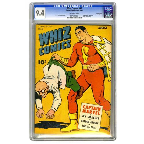 <B>Whiz Comics #57 Crowley Copy pedigree (Fawcett, 1944) CGC NM 9.4 Off-white pages.</B></I> In this Captain Marvel outing, the Big Red Cheese's story has guest appearances by Spy Smasher, Ibis the Invincible, and Golden Arrow, who all star in there own features here as well. Overstreet 2005 NM- 9.2 value = $325. CGC census 12/05: 2 in 9.4, none higher.
