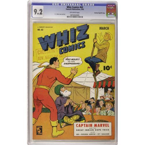 <B>Whiz Comics #63 Crowley Copy/File Copy (Fawcett, 1945) CGC NM- 9.2 Off-white pages.</B></I> Cover and art by C. C. Beck. The cover bears a "checking copy" stamp. Overstreet 2006 NM- 9.2 value = $310. CGC census 10/06: 1 in 9.2, none higher.<BR><BR><b>Shipping:</b> Slabbed Comic (<a target="_blank" href="http://www.heritageauctions.com/common/shipping.php">view shipping information</a>)