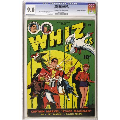 <B>Whiz Comics #71 Crowley Copy/File Copy (Fawcett, 1946) CGC VF/NM 9.0 Cream to off-white pages.</B></I> C. C. Beck cover. Beck and Basil Wolverton art. Checking Copy stamp on cover. Overstreet 2006 VF/NM 9.0 value = $216; NM- 9.2 value = $285. CGC census 10/06: 1 in 9.0, 2 higher.<BR><BR><b>Shipping:</b> Slabbed Comic (<a target="_blank" href="http://www.heritageauctions.com/common/shipping.php">view shipping information</a>)