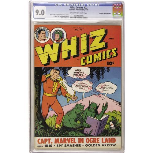 <B>Whiz Comics #73 Crowley Copy/File Copy (Fawcett, 1946) CGC VF/NM 9.0 Cream to off-white pages.</B></I> C. C. Beck cover. Beck and Basil Wolverton art. Checking Copy stamp on cover. Overstreet 2006 VF/NM 9.0 value = $219; NM- 9.2 value = $290. CGC census 10/06: 2 in 9.0, 1 higher.<BR><BR><b>Shipping:</b> Slabbed Comic (<a target="_blank" href="http://www.heritageauctions.com/common/shipping.php">view shipping information</a>)