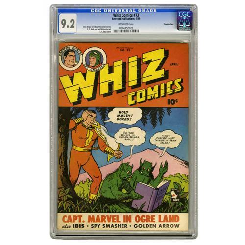 <B>Whiz Comics #73 Crowley Copy pedigree (Fawcett, 1946) CGC NM- 9.2 Off-white pages.</B></I> C. C. Beck's Captain Marvel is joined by a host of other heroes here, and there's even a half-pager by the much-collected Basil Wolverton. Overstreet 2005 NM- 9.2 value = $280. CGC census 12/05: 1 in 9.2, none higher.