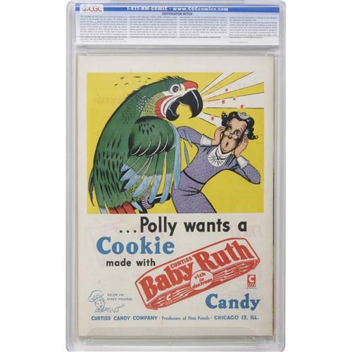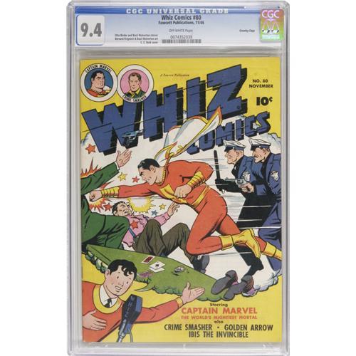 <B>Whiz Comics #80 Crowley Copy pedigree (Fawcett, 1946) CGC NM 9.4 Off-white pages.</B></I> Everybody knows and loves Captain Marvel, but who's that "business casual" fellow in the inset? Why, it's Crime Smasher, formerly the masked Spy Smasher. Basil Wolverton contributed one of his nutty "Culture Corner" features to the issue. Overstreet 2006 NM- 9.2 value = $285. CGC census 10/06: 1 in 9.4, 1 higher.<BR><BR><b>Shipping:</b> Slabbed Comic (<a target="_blank" href="http://www.heritageauctions.com/common/shipping.php">view shipping information</a>)