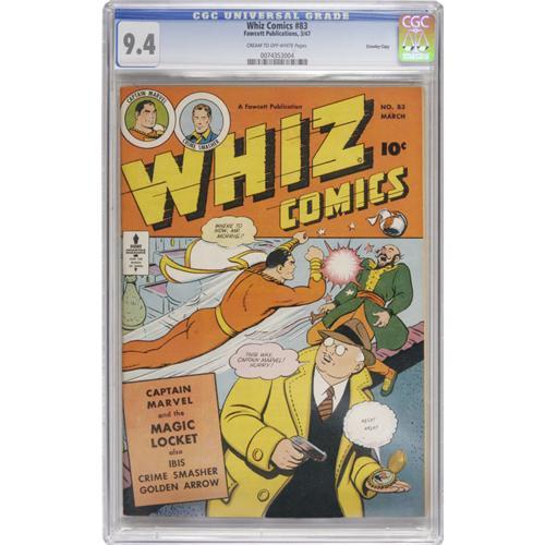 <B>Whiz Comics #83 Crowley Copy pedigree (Fawcett, 1947) CGC NM 9.4 Cream to off-white pages.</B></I> This is the only copy graded above 9.0 by CGC to date. Basil Wolverton contributed a "Culture Corner" backup feature. Overstreet 2006 NM- 9.2 value = $285. CGC census 10/06: 1 in 9.4, none higher.<BR><BR><b>Shipping:</b> Slabbed Comic (<a target="_blank" href="http://www.heritageauctions.com/common/shipping.php">view shipping information</a>)