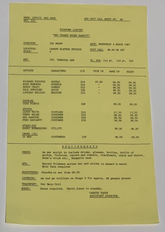 Who Framed Roger Rabbit (1988) - Production Used Call-Sheet.