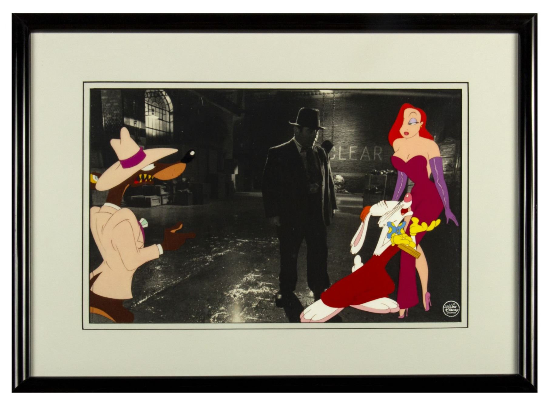 (Disney, 1988) An original animation cel from the part live-action part animated feature film "Who Framed Roger Rabbit?". The cel features the title character Roger as well as Jessica Rabbit, and Smarty of the Toon Patrol. The hand-painted cel is placed over a printed reproduction background depicting the hero Eddie Valiant. The artwork has an image size of 10"x15" within its 21.5"x16.5" frame. The artwork has not been examined out of frame, but appears to be in very good condition, with a Walt Disney seal in the lower-right corner.