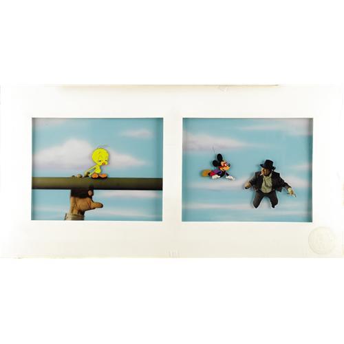 <B>"Who Framed Roger Rabbit" Production Cel Original Art, Group of 2 (Walt Disney, 1989).</B></I> On a visit to Toontown, Eddie Valiant, played by Bob Hoskins, falls through the floor of a men's room, and finds himself free-falling through the clouds. Halfway down, he springs onto a flag pole and saves himself by grasping it with one hand. Tweety Bird is perched on the pole and removes his fingers one at a time. He continues falling, passing Mickey Mouse along the way, in these two hand painted cels from "Who Framed Roger Rabbit." Both of these two original animation production cels are presented on hand painted backgrounds, along with photographic print art of Hoskins. Each has an image area of 13" x 10.5", and is in Excellent condition. Includes a certificate of authenticity. <I>From the Estate of Bruce Hamilton</B></I>. <BR><BR><B>Important notice:</B> Heritage usually auctions material at the rate of 200-250 lots per hour. On some occasions eBay Live bid software or the Internet may not be able to keep up with the pace of the auction. We recommend placing a realistic absentee bid now as insurance to avoid disappointment. Occasionally the auctioneer may eliminate or reject an eBay Live bid, and the auctioneer may also reopen a lot after the close of the eBay live bidding (usually because we missed an audience bid), and may reject your bid even if it shows you as the winning bidder. By bidding via eBay Live, you agree that Heritage may award the lot to another bidder at its sole discretion under the circumstances described above or any other reasonable circumstances. Since eBay bids are not shown to us until we open the lot on the floor, we treat those bids just like floor bids. In most cases the floor responds before the eBay bid is presented to us, due to Internet lag time, so for consistency we have made it a policy that floor bids are always considered first over tie eBay live bids. Also please note that all Heritage lots purchased through eBay Live carry a 22.5% Buyer's Premium. Please make sure you read the Terms and Conditions before you bid. This lot is being auctioned in conjunction with a live floor auction by Heritage Auction Galleries. All final auction and invoice information will be supplied by Heritage Auction Galleries, and all other information should be considered preliminary. Lot:41001 <BR><BR><B>Winning Notification and Billing:</B> After the FINAL session in this auction is complete, Heritage will send e-mail and snail mail invoices. This process normally takes several days. All final auction and invoice information will be supplied by Heritage Auction Galleries, and all other information should be considered preliminary. <BR><BR>This auction will be conducted on a live auction floor and over the Internet through eBay Live. If you choose to place an absentee bid, please take a moment to <font color='#0000ff'><u><a href='http://pages.ebay.com/liveauctions/help/before/laabsentee.html'>learn how eBay Live absentee bidding works</a></u></font><font color='#000000'>