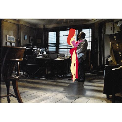 <B>"Who Framed Roger Rabbit" Production Cel Original Art (Walt Disney, 1989).</B></I> "I'll do anything for my husband, Mr. Valiant. Anything." Eddie Valiant (Bob Hoskins) attempts to get dressed as Jessica Rabbit draws near, in this hand painted cel from "Who Framed Roger Rabbit," presented on a photographic print background. The image area measures 15.5" x 10.5", and the condition is Excellent. Includes a certificate of authenticity. <I>From the Estate of Bruce Hamilton</B></I>. <BR><BR><B>Important notice:</B> Heritage usually auctions material at the rate of 200-250 lots per hour. On some occasions eBay Live bid software or the Internet may not be able to keep up with the pace of the auction. We recommend placing a realistic absentee bid now as insurance to avoid disappointment. Occasionally the auctioneer may eliminate or reject an eBay Live bid, and the auctioneer may also reopen a lot after the close of the eBay live bidding (usually because we missed an audience bid), and may reject your bid even if it shows you as the winning bidder. By bidding via eBay Live, you agree that Heritage may award the lot to another bidder at its sole discretion under the circumstances described above or any other reasonable circumstances. Since eBay bids are not shown to us until we open the lot on the floor, we treat those bids just like floor bids. In most cases the floor responds before the eBay bid is presented to us, due to Internet lag time, so for consistency we have made it a policy that floor bids are always considered first over tie eBay live bids. Also please note that all Heritage lots purchased through eBay Live carry a 22.5% Buyer's Premium. Please make sure you read the Terms and Conditions before you bid. This lot is being auctioned in conjunction with a live floor auction by Heritage Auction Galleries. All final auction and invoice information will be supplied by Heritage Auction Galleries, and all other information should be considered preliminary. Lot:41001 <BR><BR><B>Winning Notification and Billing:</B> After the FINAL session in this auction is complete, Heritage will send e-mail and snail mail invoices. This process normally takes several days. All final auction and invoice information will be supplied by Heritage Auction Galleries, and all other information should be considered preliminary. <BR><BR>This auction will be conducted on a live auction floor and over the Internet through eBay Live. If you choose to place an absentee bid, please take a moment to <font color='#0000ff'><u><a href='http://pages.ebay.com/liveauctions/help/before/laabsentee.html'>learn how eBay Live absentee bidding works</a></u></font><font color='#000000'>