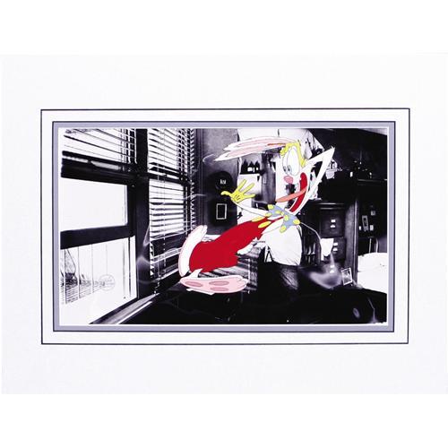 <B>"Who Framed Roger Rabbit" Production Cel Original Art (Walt Disney, 1989).</B></I> Expressive, hand painted cel of an out of control Roger Rabbit in Eddie Valiant's office. Presented on a photographic print background, the image area measures 13.5" x 8". The condition is Excellent. Includes a certificate of authenticity.<BR><BR><b>Shipping:</b> Large Flat (<a target="_blank" href="http://www.heritageauctions.com/common/shipping.php">view shipping information</a>)