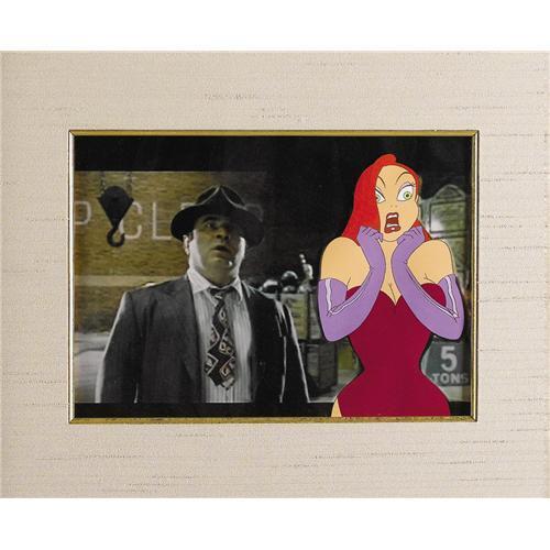 <B>"Who Framed Roger Rabbit" Production Cel Original Art (Disney, 1988).</B></I> "Who Framed Roger Rabbit" won four Academy Awards for its technical wizardry, and reigned as the undisputed box-office champion for 1988. A hysterical Jessica stands next to Eddie Valiant, in this hand painted cel, presented on a photographic print background. The image area measures 13.5" x 9.5", and the condition is Excellent. Includes a certificate of authenticity.<BR><BR><b>Shipping:</b> Framed (<a target="_blank" href="http://www.heritageauctions.com/common/shipping.php">view shipping information</a>)