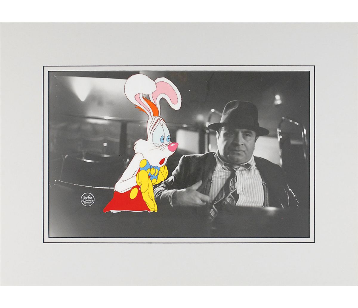 (Walt Disney Studios, 1988) Original production cel featuring Roger Rabbit from Who Framed Roger Rabbit? The cel is placed on a matching copy background featuring Bob Hoskins as Eddie Valiant. Image measures 3.5 x 7 with overall dimensions of 13 x 8.25. Mat dimensions are 18 x 13.25. In fine condition.