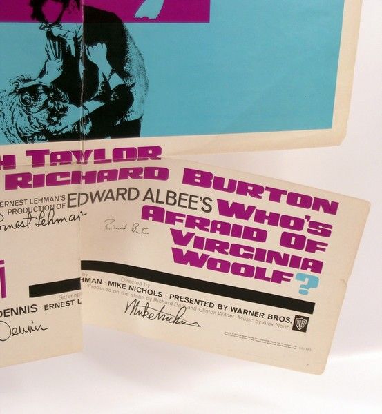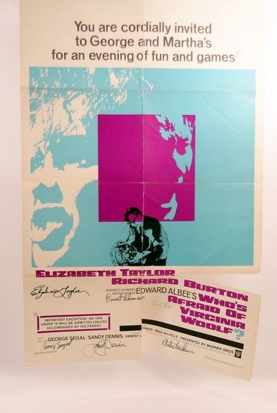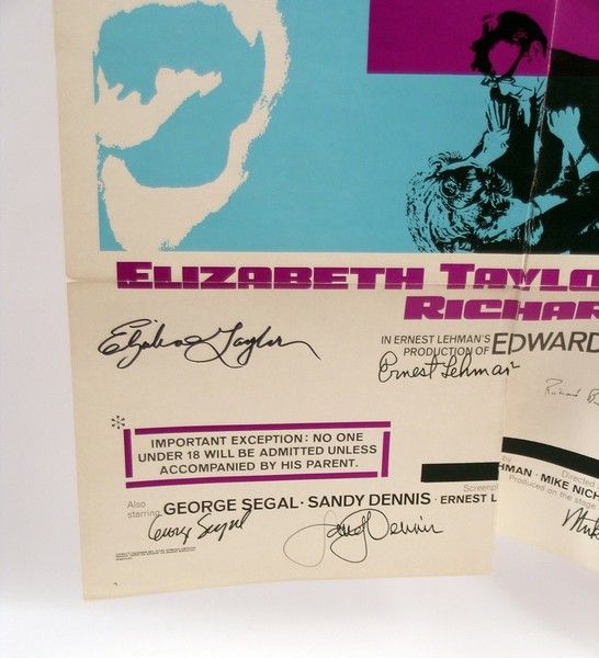 In 1966, the emotional fireworks from the war of "George & Martha" in "Who's Afraid of Virginia Woolf" (1966) became one of the most award laden movies of all time. In the Oscar category, it won for Best Actress (Elizabeth Taylor), Best Supporting Actress (Sandy Dennis),Best Actor (Richard Burton), Best Supporting Actor (George Segal), Best Director (Mike Nicholas), and Best Picture of the Year (Ernest Lehman). This is an original theatrical poster of this classic film, signed by all the Oscar winners: Elizabeth Taylor, Richard Burton, George Segal, Sandy Dennis, Mike Nicholas and Ernest Lehman. Many of these signatures are extremely rare, and to have them all together truly makes for an amazing collectable. Note that the poster has some "fold splits" near the bottom, that are easily repairable, but do not affect the autographs. Poster is approx. 40"x27".
