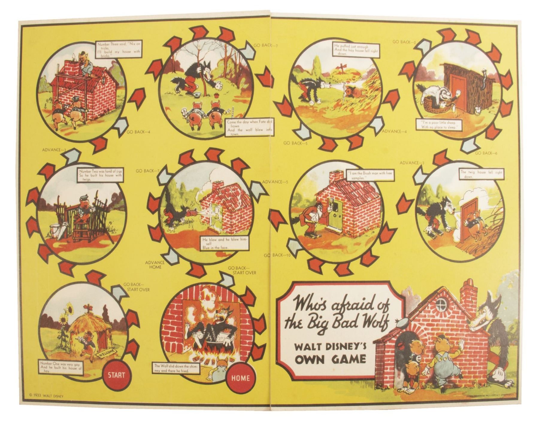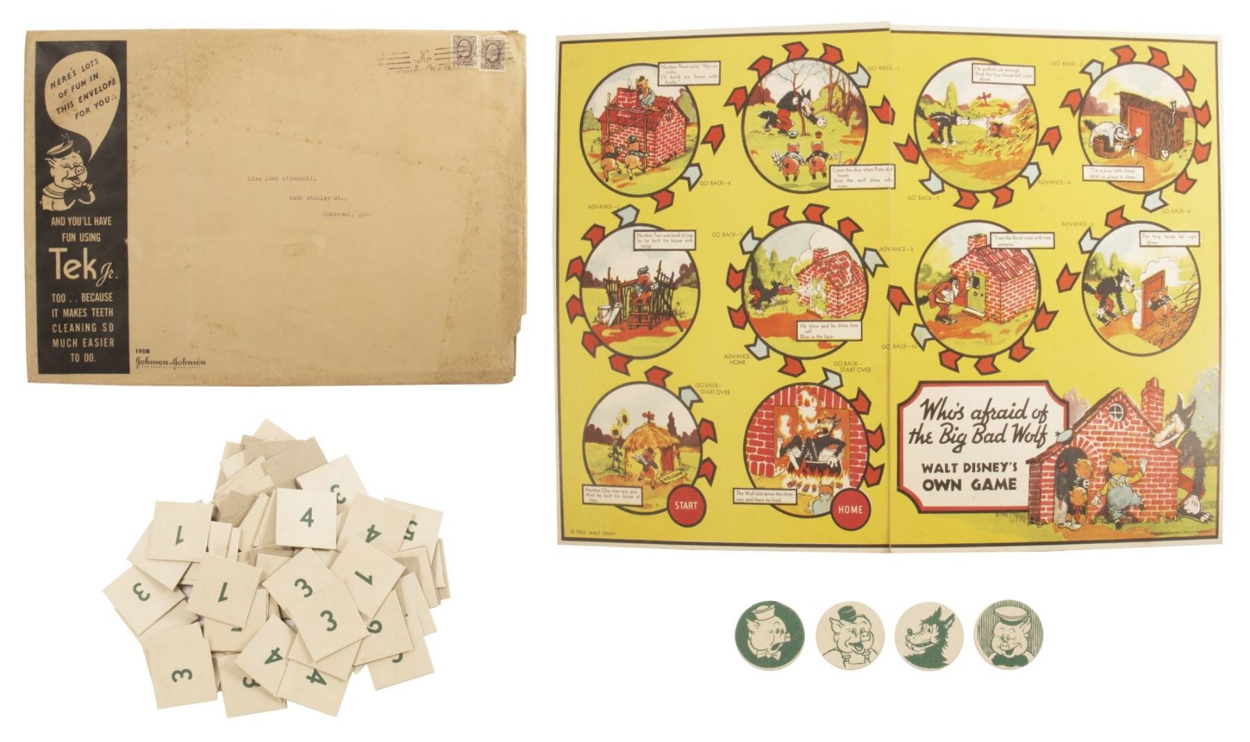 (Johnson & Johnson, 1934) An original board game featuring the Three Little Pigs and the Big Bad Wolf that was released as a promotional item by Johnson & Johnson. The envelope contains the game board, pieces, instructions, and a letter from the company apologizing for the delay in sending the game. The contents fit within the 10.5"x15" envelope and are in fair condition, with some tears, discoloration, and general wear from use. All the pieces have been punched out of the instruction sheet and are stored in a small envelope.