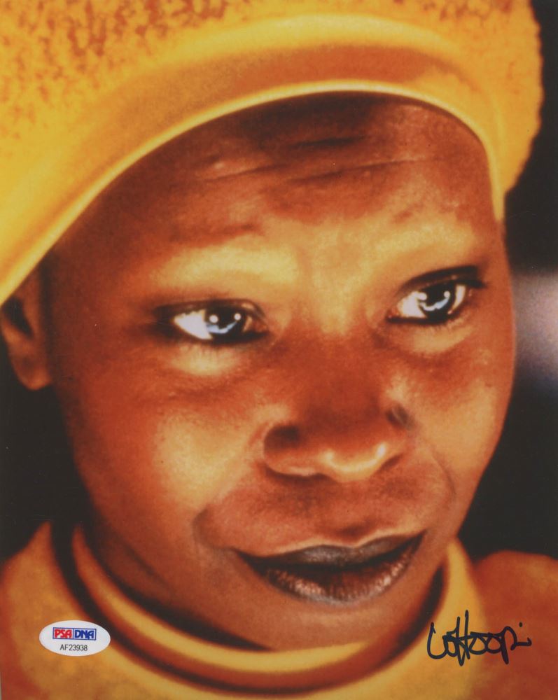 Photo measures 8" x 10" in size and has been hand-signed in blue felt-tip pen by Whoopi Goldberg.