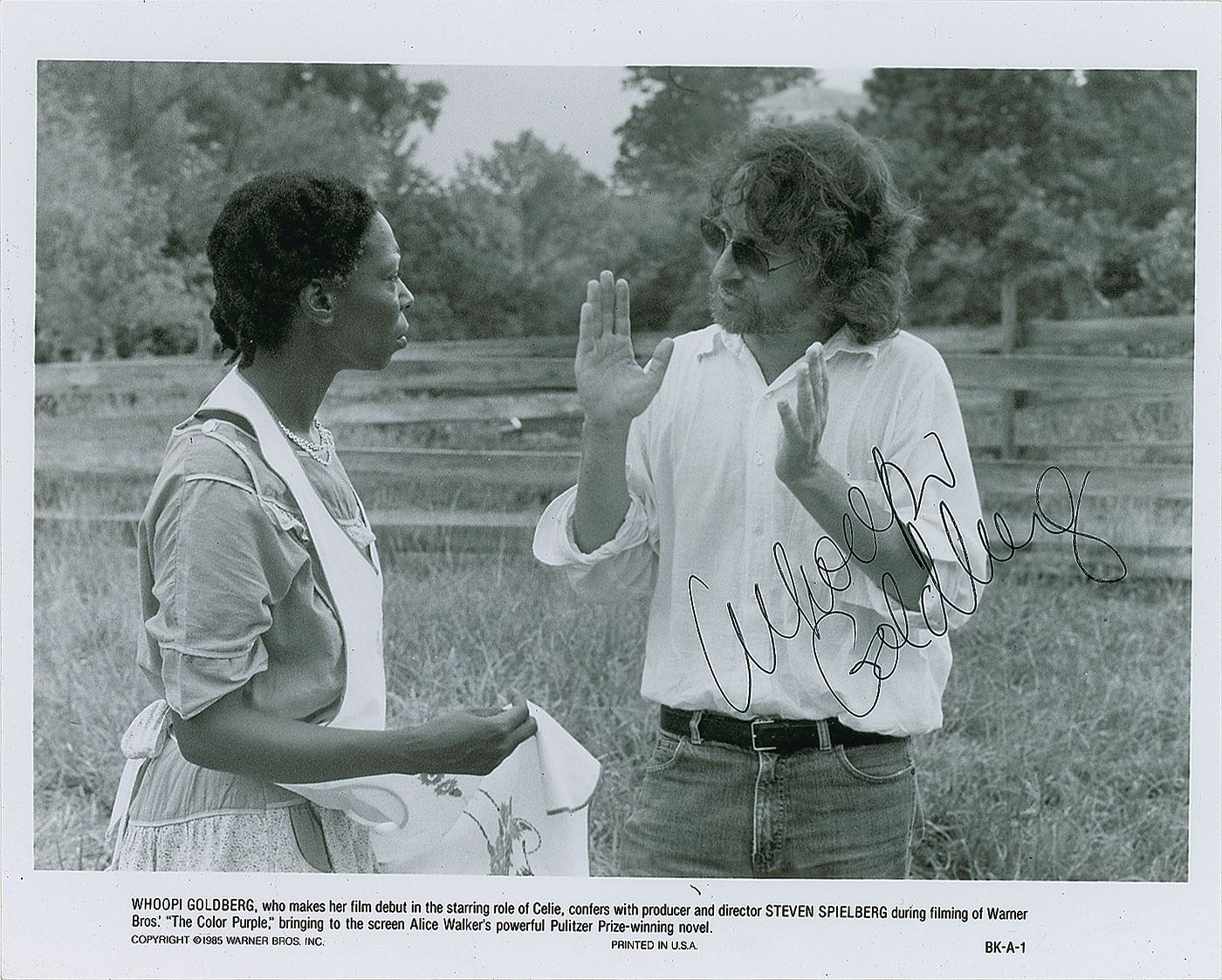 Glossy 10 x 8 publicity photo of Goldberg in her film debut as Celie Harris Johnson in The Color Purple, signed in black felt tip. In fine condition. From the Harvey and Rhoda Kuflik Collection.