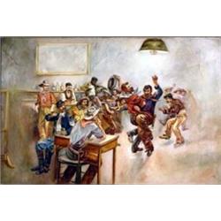 "Whooping It Up In The Old Saloon". Unsigned oil on canvas. Ex Otha Wearin collection. Wonderful folk painting. 16" x 24". Estimate $1,000-$1,500.