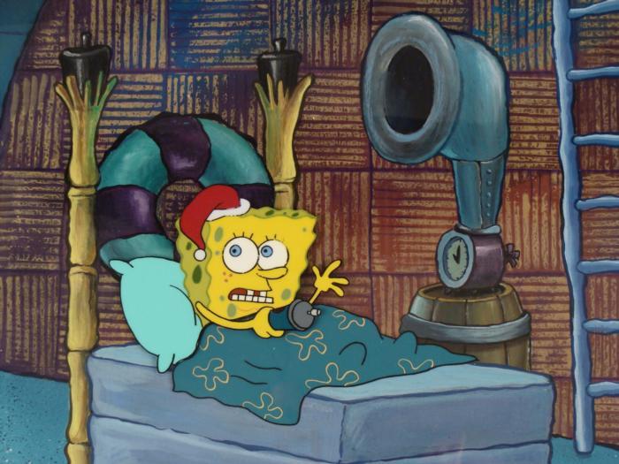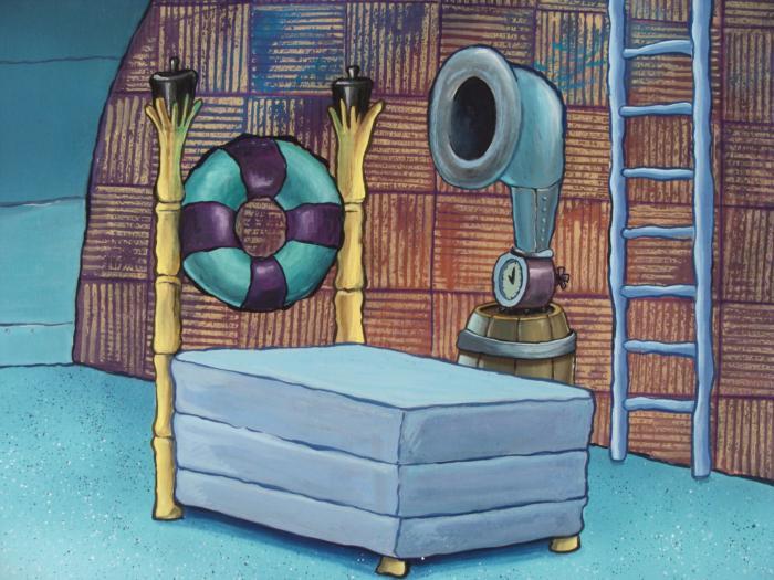 To create production cels, the original animator's drawing is transferred onto an acetate cel (by hand-inking and/or photo copying). The cel is then hand-painted on the reverse side. The background accompanying this set-up is a hand-painted original production background. The background is ready to be matted and framed. It is a colored background with a cel and has the animator's notations at the bottom of the background and cel. The cel has multi-layers; first Spongebob and the pillow and then the blanket. There is the Nickelodeon stamp on the lower right corner of the first cel.