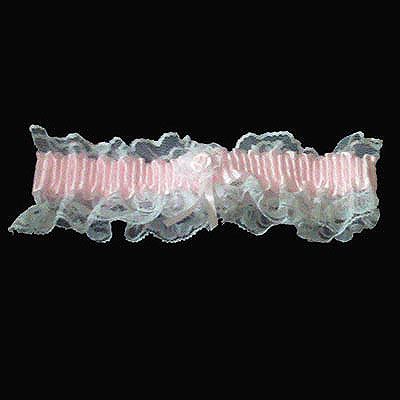 Whtie And Pink Leg Garter **|**|** White lace with pink satin center leg garter. Beautiful with wedding dresses, prom dresses or homecoming dresses. Lace garters, satin garters and white and pink garters. 1EA. One size fits most. UPC# 852668564574