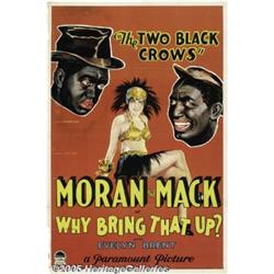 <B>Why Bring It Up? (Paramount, 1929)</B></I> One Sheet (27" X 41"). Moran and Mack, better known as "The Two Black Crows," star in this picture with Evelyn Brent. This is the first picture the comedy team starred in, impersonating black people as they did in their vaudeville routines. The poster has a slight separation in the upper center point and some ruffling to the left border. The bottom of the left border is also missing some paper, but this doesn't extend into the red background. There are some scratches in the left side of the poster as well, but these don't break the color of the paper. Fine+.