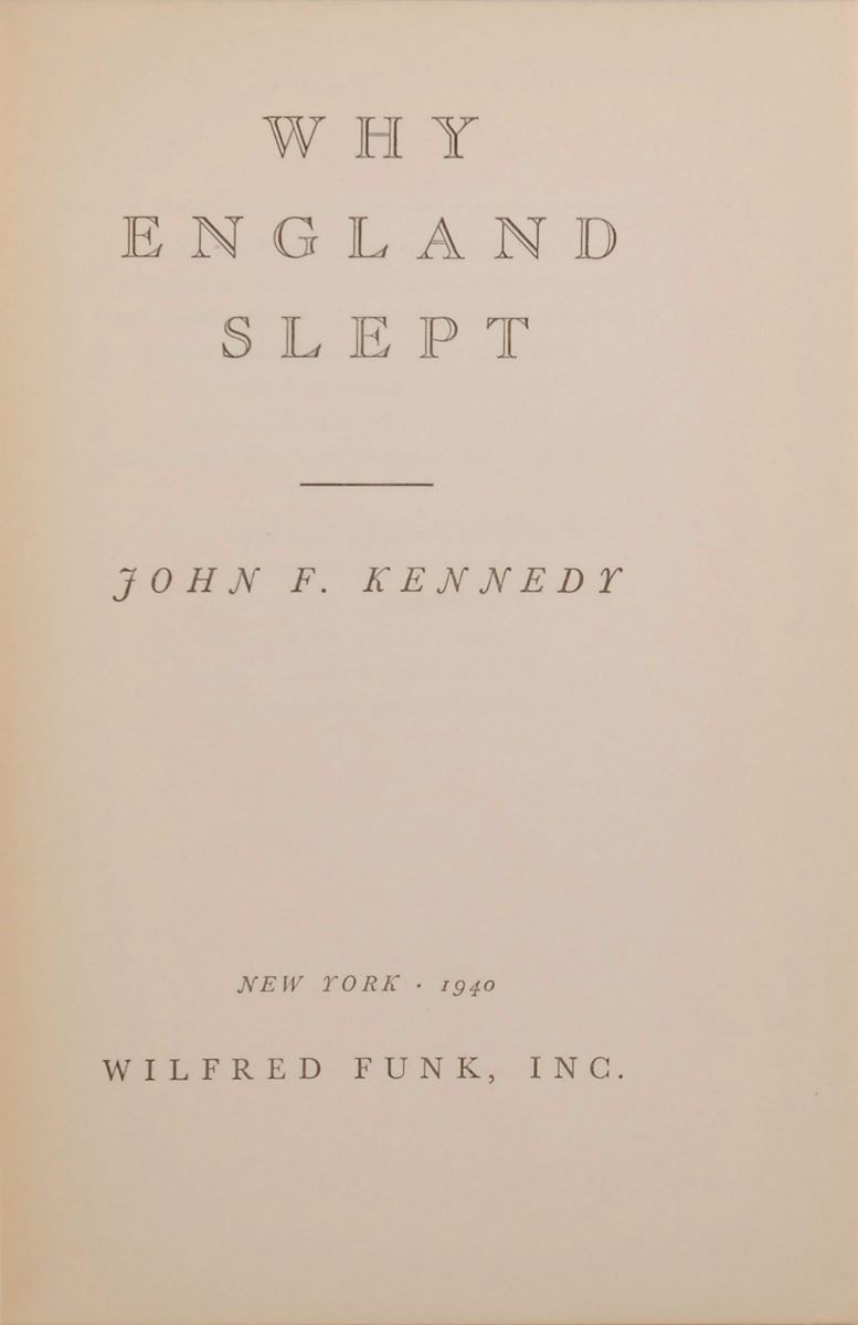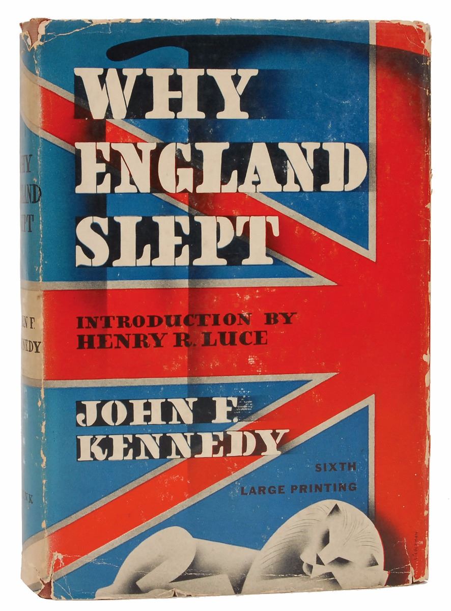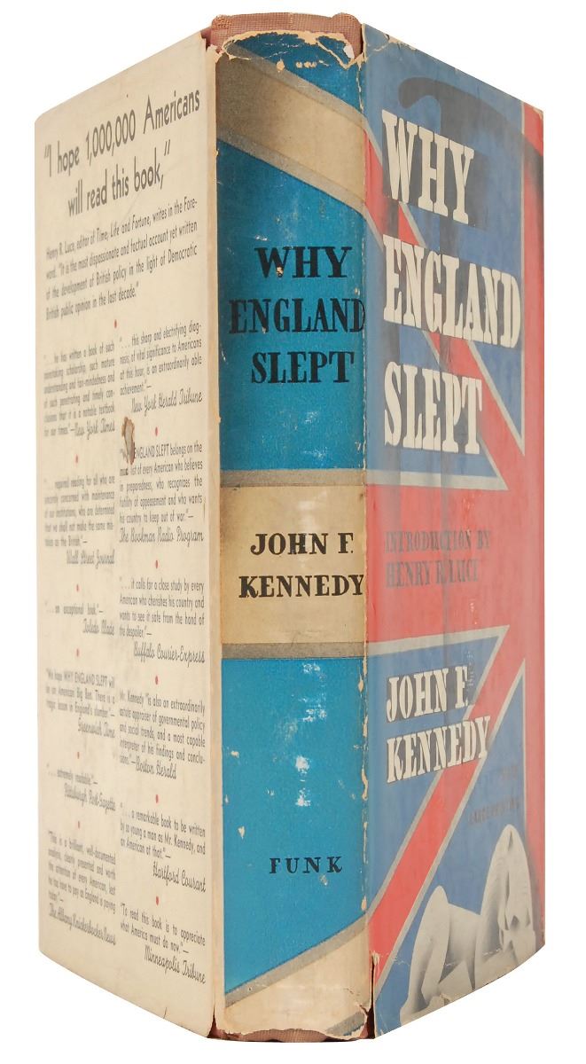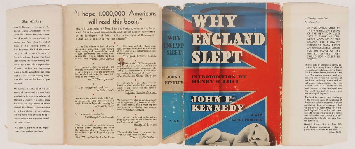 Unsigned book: Why England Slept by John F. Kennedy. Sixth printing. NY: Wilfred Funk, Inc., 1940. Hardcover with dust jacket, 6 x 8.25, 252 pages. In very good to fine condition, with creasing, small tears, and soiling to dust jacket