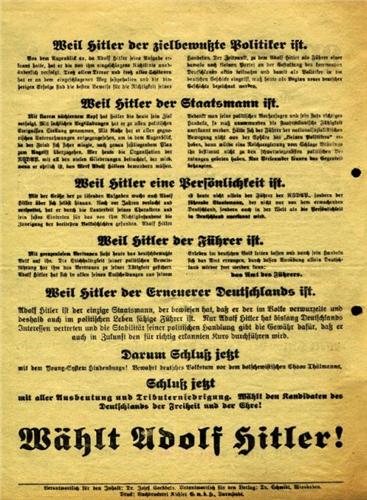 Why Hitler? Election broadside, written by Joseph Goebbels, whose name appears as author. For the April 1932 "second round" election between von Hindenburg and Hitler. "Why Hitler?," printed both sides, 9 x 11 -1/2 sheet, enumerating reasons, presented in a pungent propaganda style. Calls Hitler "a man of the people...a fighter...carrying the banner of National Socialism...a politician with clear goals...a real leader...end Hindenburg's systems as well as Thalmann's Marxist chaos...Vote now...Vote Hitler!" Apparently directed at undecided voters. One of the important propaganda exhibits of the period. Very fine.