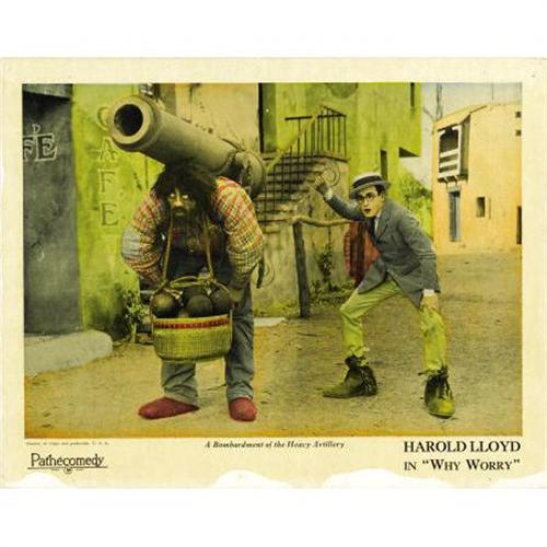 <B>Why Worry (Pathe Exchange Inc., 1923).</B></I> Lobby Card (11" X 14"). Harold Lloyd's character was originally to go to Mexico, but after accusations the film of unfair stereotyping he decided to change the location to a remote island in the Pacific. However, it is not difficult to figure out where the film was really meant to take place. This great card has pinholes in the corners and minor edge wear. The varnish used to cover the cards after hand-tinting was not applied evenly to the bottom of the card but this does not affect the image in anyway. Very Fine. ****<BR><BR><b>Shipping:</b> Flat Material, Small (<a target="_blank" href="http://www.heritageauctions.com/common/shipping.php">view shipping information</a>)