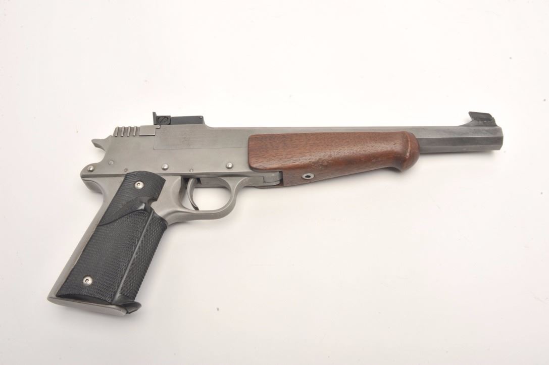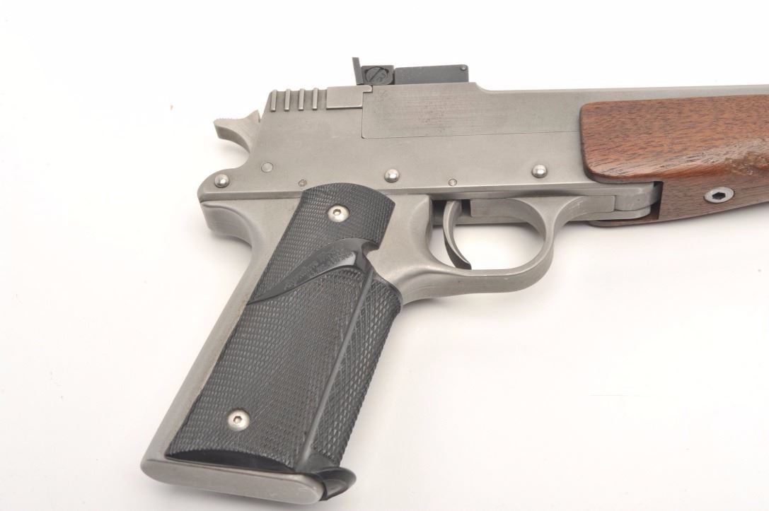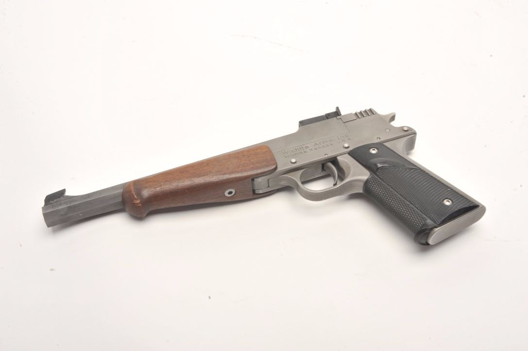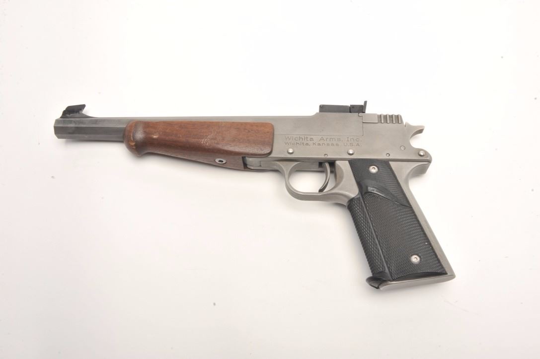Wichita Arms Single Shot Target pistol in brushed stainless finish and chambered for .357 Mag., S/N 280. 10 ½” octagon barrel with wood fore end and Pachmayr grips. Excellent used condition. (CA Legal/No PPT) Est.:$400-$800