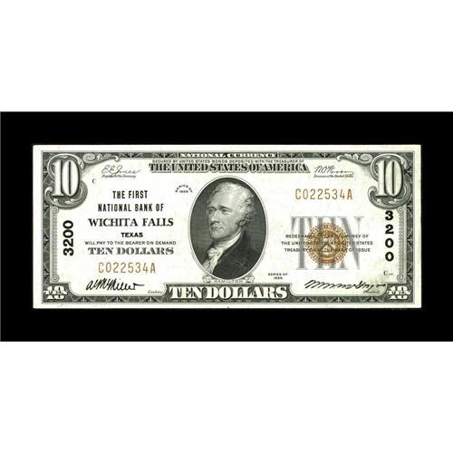 <B>Wichita Falls, TX</B></I> - $10 1929 Ty. 1 <B>The First NB</B></I> Ch. # 3200<BR>A bright and fresh example removed from the Choice designation by one hard to spot corner fold. <B>Crisp Uncirculated.</B></I><BR><I>From The Rolling Plains Collection</B></I><BR><BR><b>Shipping:</b> Coins & Currency (<a target="_blank" href="http://www.heritageauctions.com/common/shipping.php">view shipping information</a>)