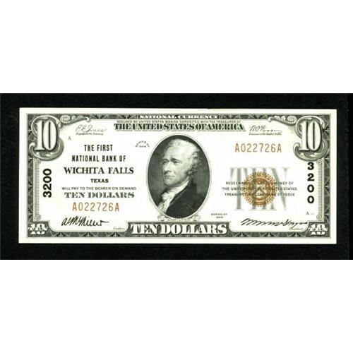 <B>Wichita Falls, TX</B></I> - $10 1929 Ty. 1 <B>The First NB</B></I> Ch. # 3200<BR> This piece lacks a fold, though there is a bit too much handling for a full AU grade. This bank started with the title, The Panhandle NB. <B>Extremely Fine.</B></I><BR><BR><b>Shipping:</b> Coins & Currency (<a target="_blank" href="http://www.heritageauctions.com/common/shipping.php">view shipping information</a>)