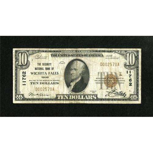 <B>Wichita Falls, TX</B></I> - $10 1929 Ty. 1 <B>The Security NB</B></I> Ch. # 11762<BR> This is from the scarcer of the small types with only three $10s known. <B>Very Good-Fine</B></I>.<BR><I>From The Rolling Plains Collection</B></I><BR><BR><b>Shipping:</b> Coins & Currency (<a target="_blank" href="http://www.heritageauctions.com/common/shipping.php">view shipping information</a>)