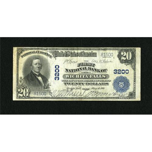 <B>Wichita Falls, TX - </B></I>$20 1902 Plain Back Fr. 650<B> The First NB </B></I>Ch. # 3200<B></B></I><BR> A pleasing <B>Very Fine</B></I> example from this popular town in North Texas.<BR><BR><b>Shipping:</b> Coins & Currency (<a target="_blank" href="http://www.heritageauctions.com/common/shipping.php">view shipping information</a>)